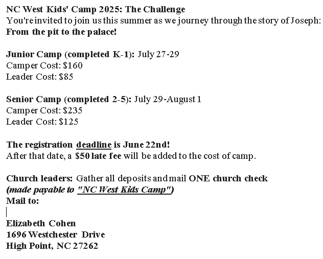 Stay in touch with all things Kids on the NC West Wesleyan Kids Leader Facebook page. CLICK HERE TO CONNECT